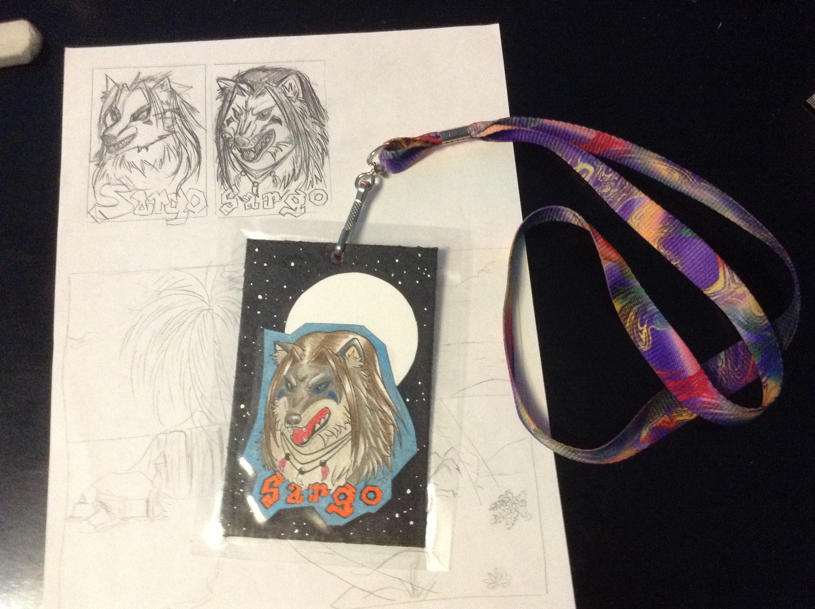 Small laminated custom artwork used as badges at cons and tags for your bags!
