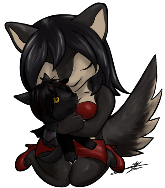 The Sake Ninja Chibi snuggling with her plushie (its her mate Sirus)
