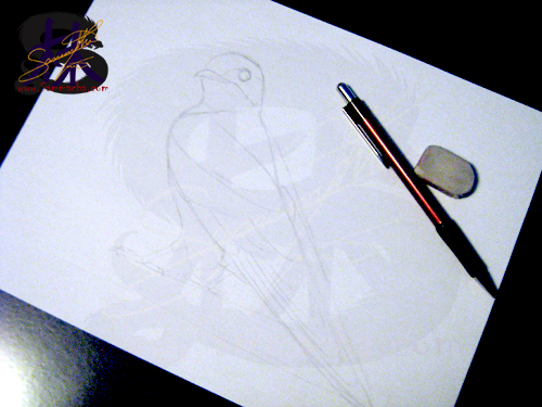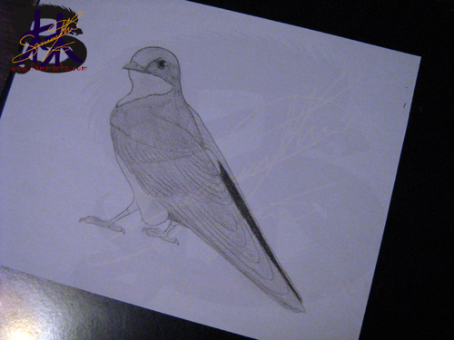 - Now the main features are easy to see. We know where the eye, the brow and all the feathers are going. we know the direction of the feather growth and where the shadows will need to occur. we can now start to shade in the mass areas/block in the different shades.